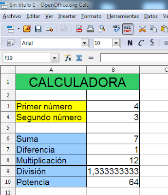 Abre la hoja de cálculo OpenOffice Calc y escribe las fórmulas necesarias para construir una calculadora como la siguiente, a la que le introducimos dos números y nos ofrece las distintas operaciones entre ellas.